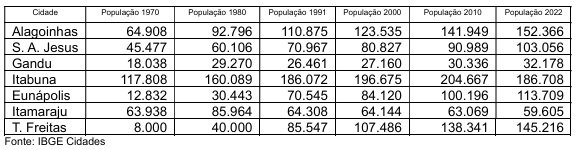 Continuando com minhas pesquisas, seguem abaixo, detalhadamente, as informações extraídas do IBGE Cidades com relação à população das maiores cidades da Bahia, margeadas pela BR-101, nas últimas seis décadas: