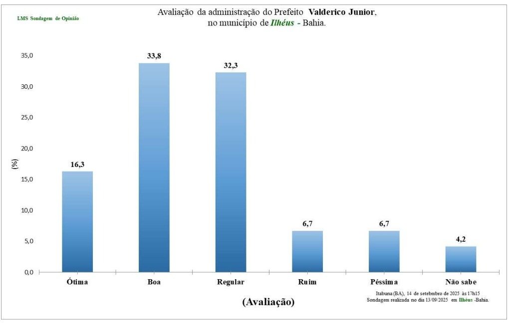 A administração do prefeito Valderico Junior (UB) recebeu a aprovação de 50,1% dos entrevistados em pesquisa da LMS Sondagem de Opinião. Essa é a soma dos que consideram a gestão boa (33,8%) ou ótima (16,3%). Para 32,3% das pessoas ouvidas, o governo é regular, enquanto 6,7% julgaram-no ruim e 6,7% péssimo. O quesito “não sabe” foi o respondido por 4,2%.