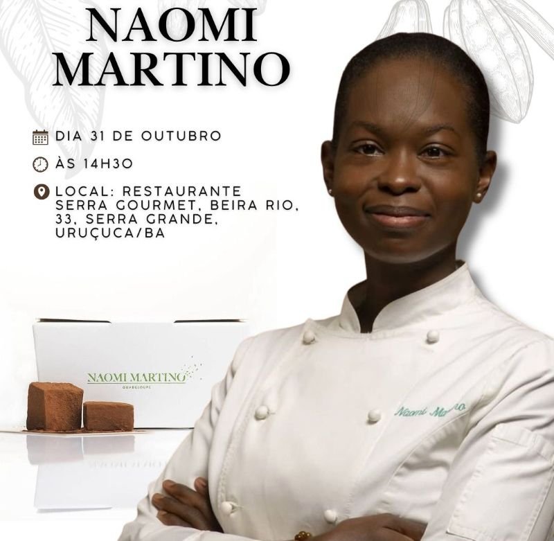 A chef e chocolatier Noami Martino comanda a primeira e única fábrica de chocolates finos de Guadalupe, nas Antilhas Francesas, e vem encantando o mundo. Na próxima sexta-feira (31), Naomi promete um mergulho na árte do chocolate em Serra Grande, a partir das 14h30min, no Restaurante Serra Gourmet, na Beira Rio, em Serra Grande, Uruçuca.