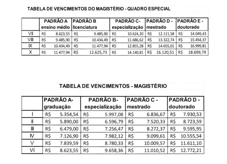 Para os professores do quadro especial que têm doutorado e estão no auge da carreira no município, o salário chegou a R$ 18.669,79. A remuneração em cada nível da carreira docente está detalhado nas tabelas a seguir.