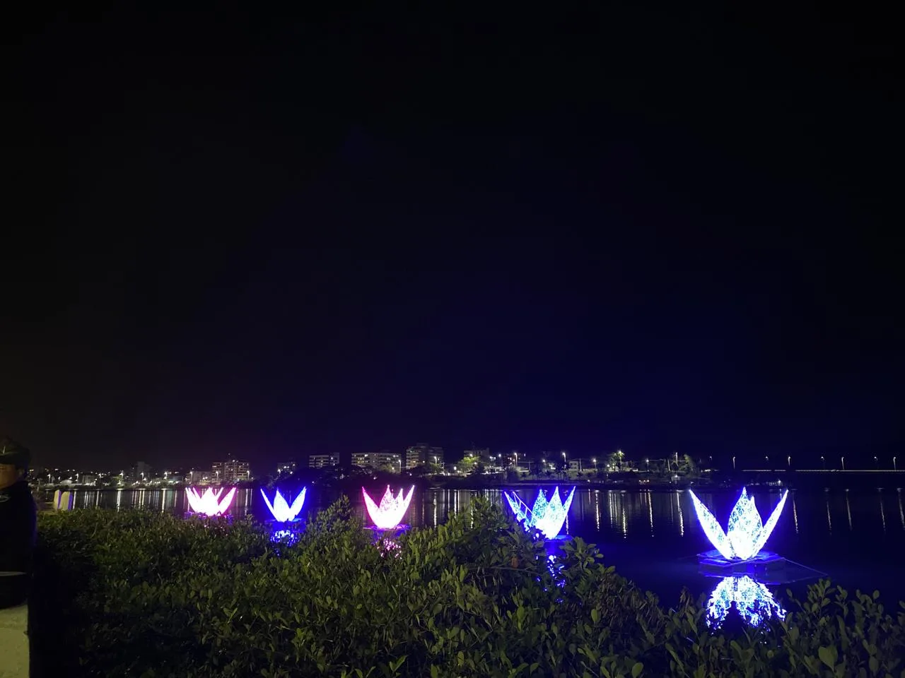 A Avenida 2 de Julho, em Ilhéus, está mais movimentada do que de costume para uma noite de quarta-feira. A decoração natalina atrai famílias às margens da foz do Rio Cachoeira. Na lâmina d’água, figuras que lembram flores produzem um belo efeito visual. Crianças aproveitam o cenário luminoso para brincar na Casa do Papai Noel. Atentos ao movimento, dois guardas civis municipais fazem a segurança no local.