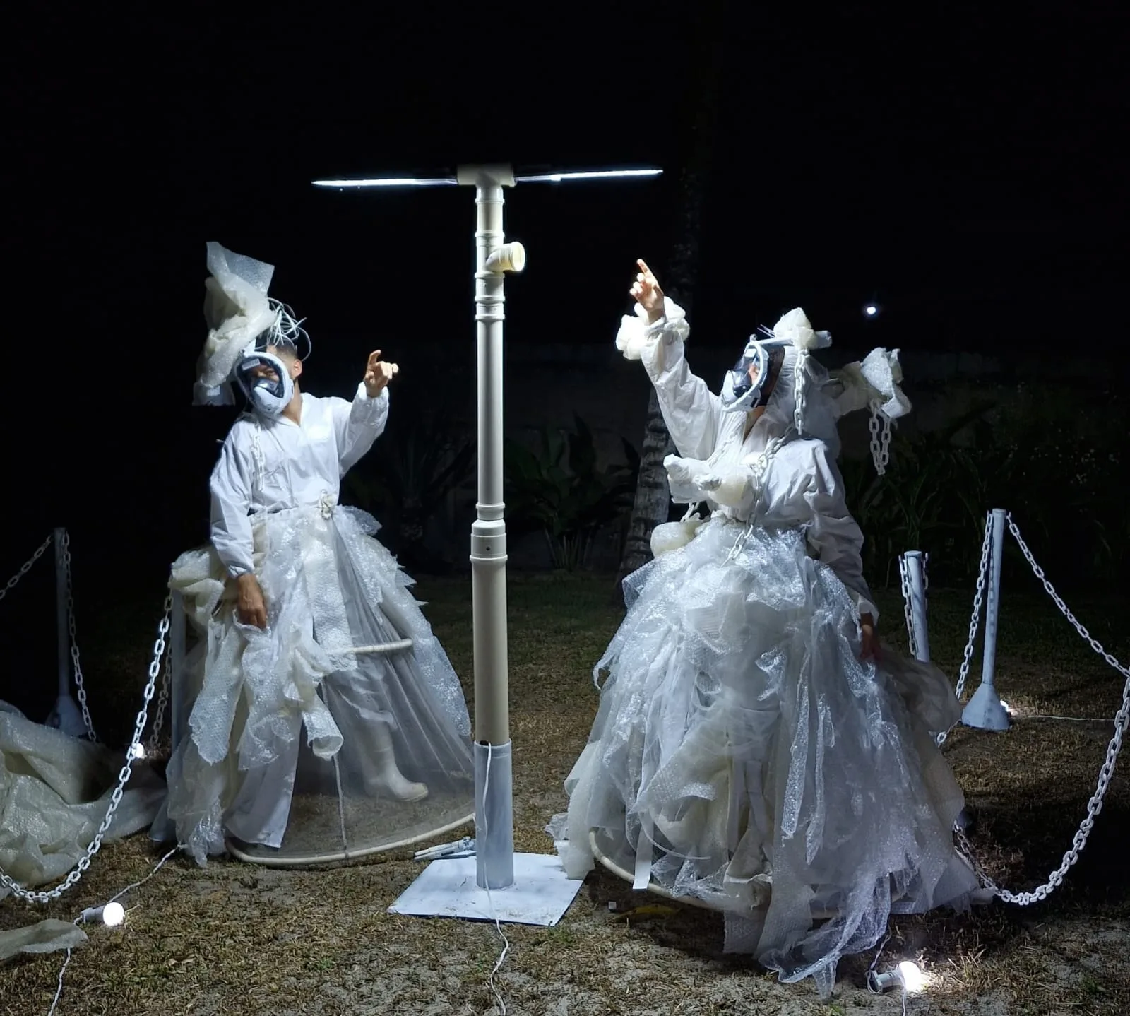 Com direção de Luís Alonso-Aude e atuação de Márcia Mascarenhas e Rafael Magalhães, a obra combina teatro e movimento para abordar o colapso ambiental, tendo o plástico como elemento central da narrativa. Em cena, dois seres habitam um território pós-apocalíptico, onde medem, controlam e catalogam vestígios de um cavalo.
