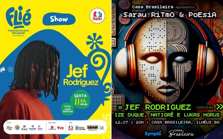 O MC Jef Rodriguez desembarca neste final de semana em Ilhéus, sua terra Natal, para dois shows. O primeiro será nesta sexta-feira (11), às 19h30min, no Colégio Estadual de Tempo Integral Professor Carlos Roberto Arléo Barbosa, localizado no antigo CSU, na Barra, zona norte da cidade, com entrada franca, durante o Festival Literário Estudantil do Litoral Sul (Flié).
